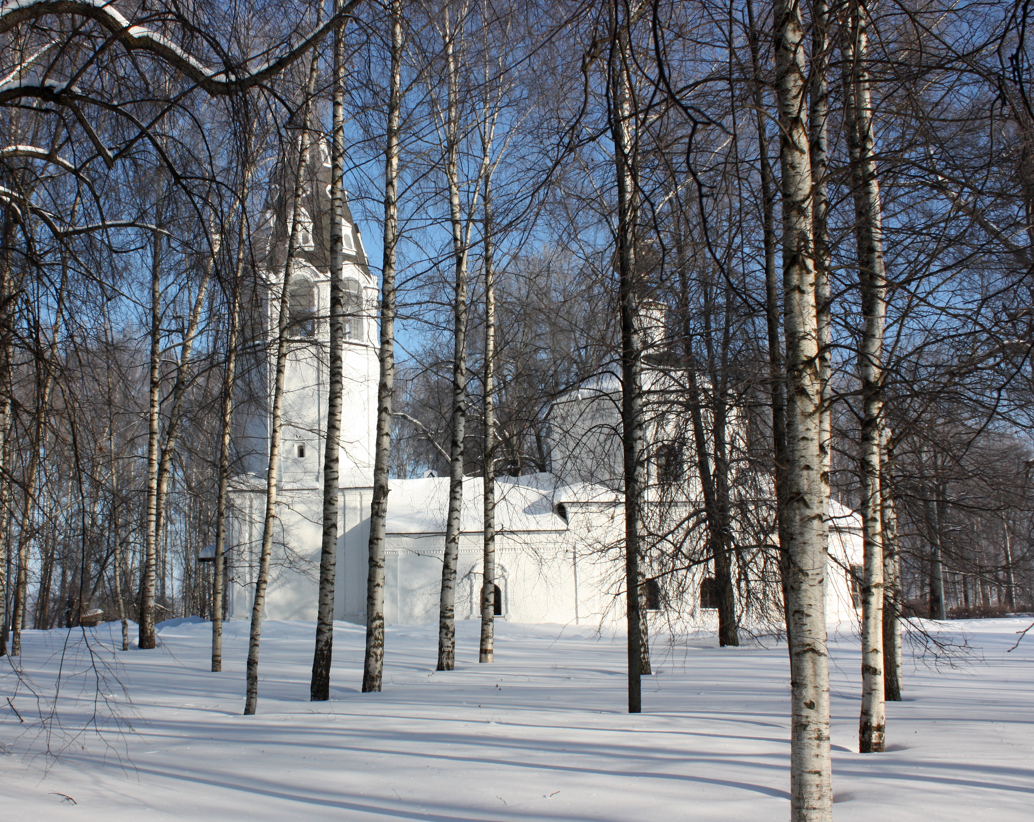 Лёгкий морозец, полуденный свет неяркого зимнего солнца, тишина, и только снег поскрипывает под ногами. Работать приходится быстро, часто меняя кисти, чтобы не застыли краски. Получился «портрет» церкви на фоне зимнего пейзажа. Плотными корпусными мазками «сконструированы» каменные стены, купол, колокольня с пустыми арочными проемами без звонницы, а за ней – густая синева неба. Так же густо и плотно изображён сиреневый снег. От берёз протянулись по снегу синие тени. Игра бликов и теней расцвечивает белизну оштукатуренных стен храма розово-сиреневыми, зеленоватыми и сине-серыми оттенками… Работа завершена. Растерев озябшие пальцы, убрав кисти и краски, художник складывает свой этюдник.