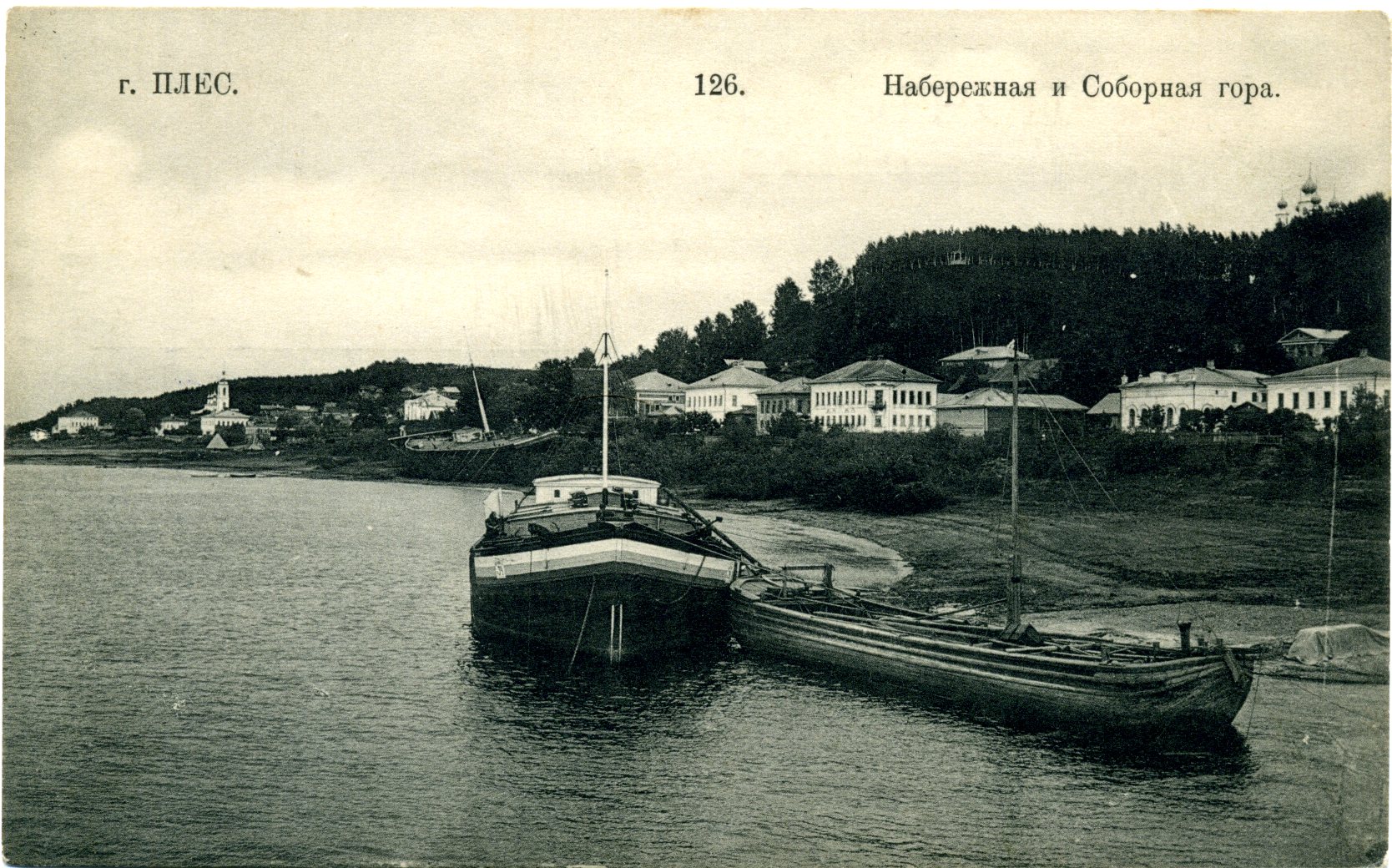 Плёсский причал, стоял, очевидно, в центре набережной около дома 39 по ул. Советской. Рядом располагается сквер, излюбленное место плесских художников, выставляющих свои работы на продажу. Справа среди зелени на набережной виднеется один из купеческих домов (ул. Советская, 25), вдали возвышается колокольня Варваринской церкви 1821 года постройки.