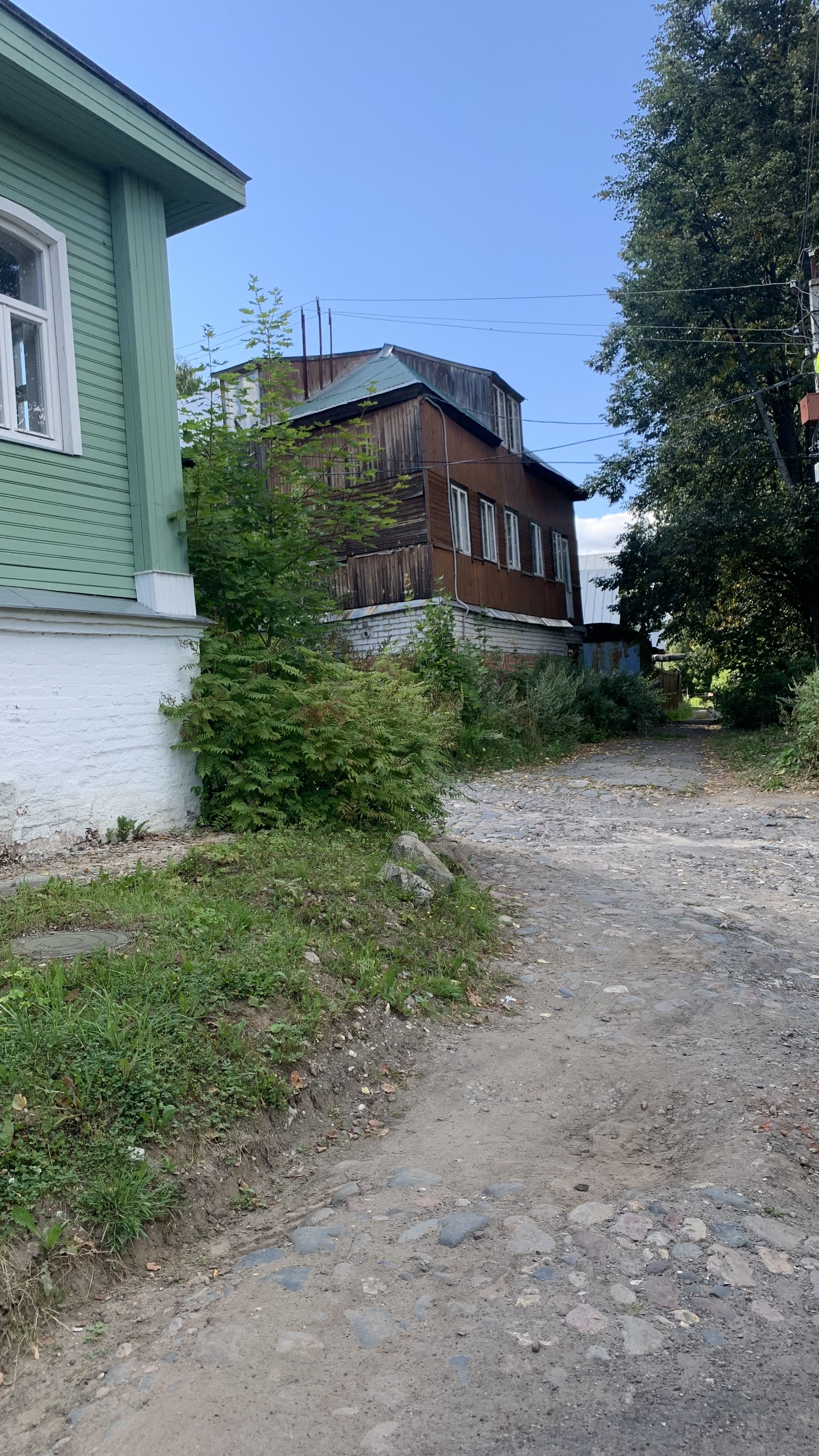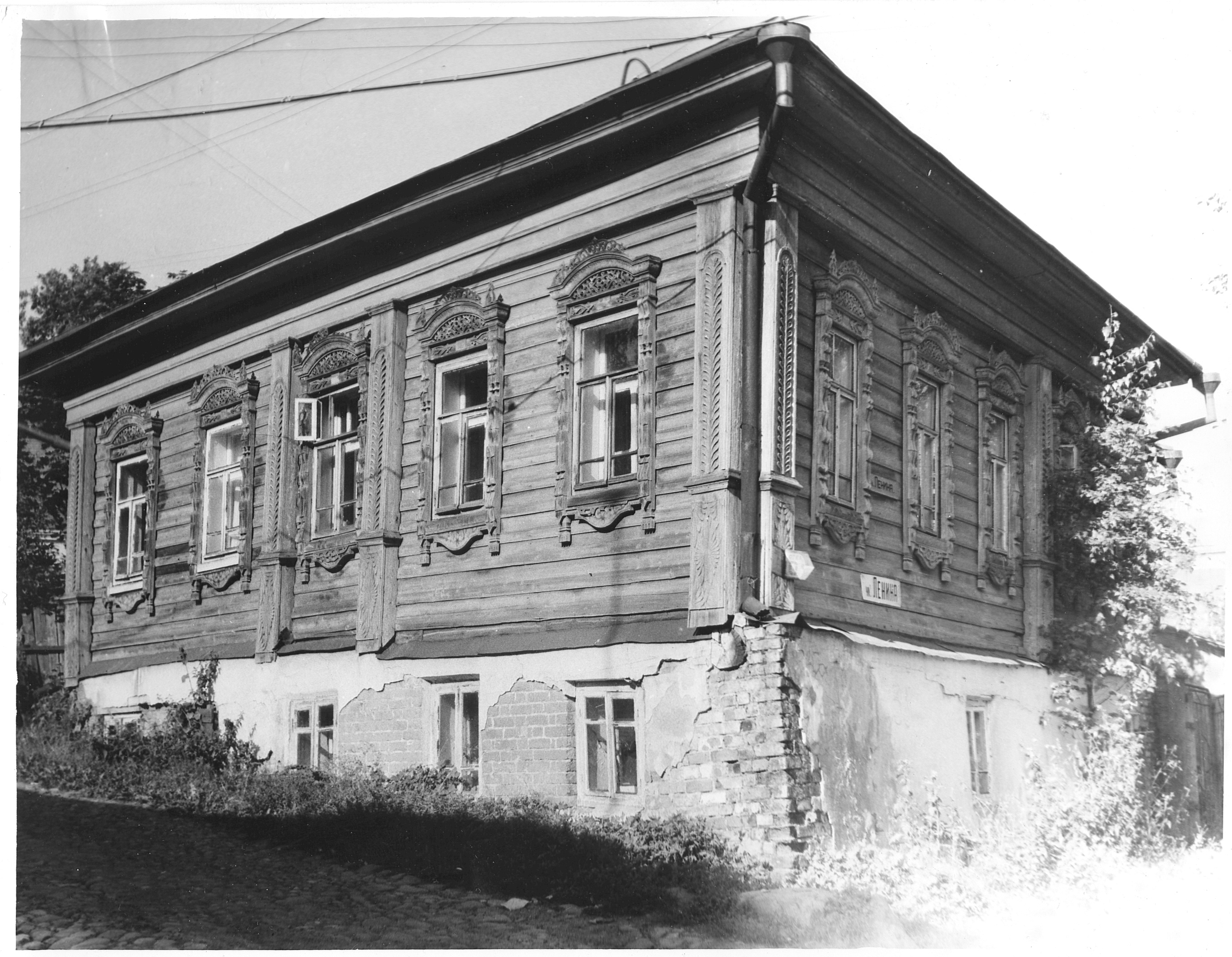 На переднем плане часть деревянного двухэтажного дома, в 1914 г., предположительно, принадлежавшего Алексею Александровичу Александрову (ул. Ленина, 33). Через улицу Островского видны дома, владельцами которых в том же году были наследники Ивана Васильевича Калашникова (ул. Ленина, 35-37а).