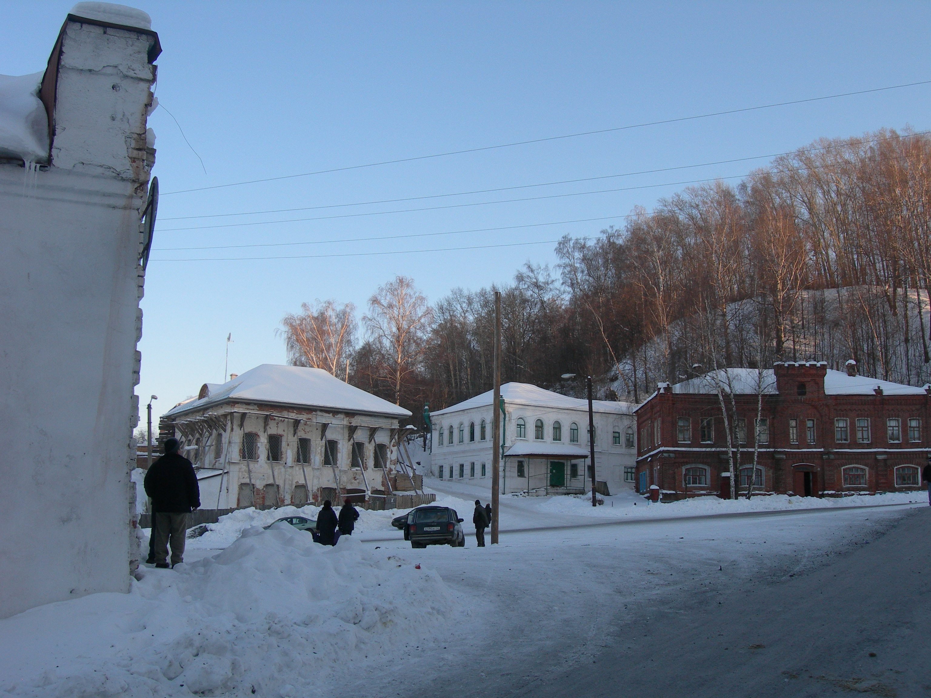 Слева в композиции выделяется часть Воскресенской церкви с желтовато-зелёными стенами и простым силуэтом. Справа расположен белый домик с красной крышей.
