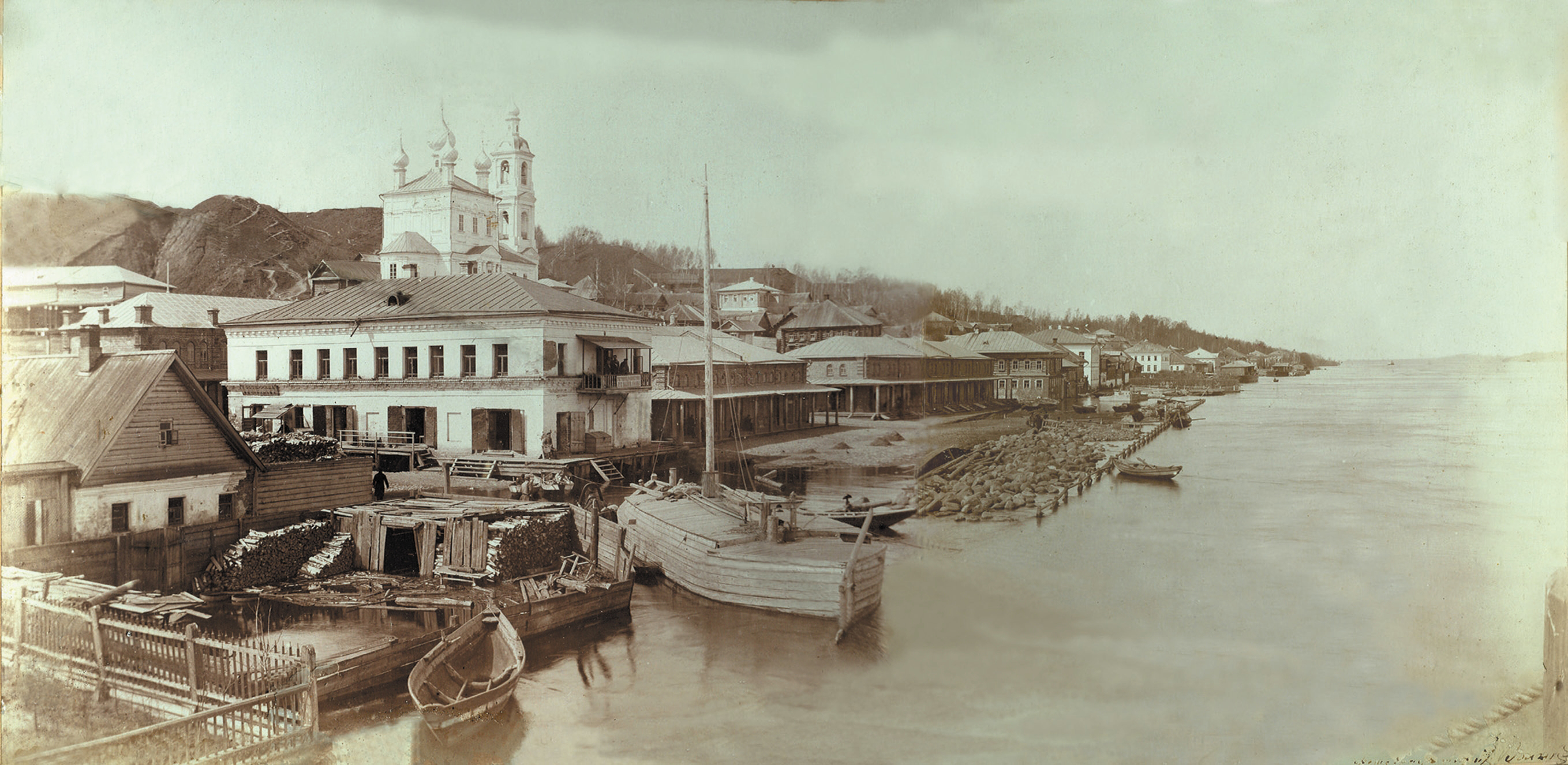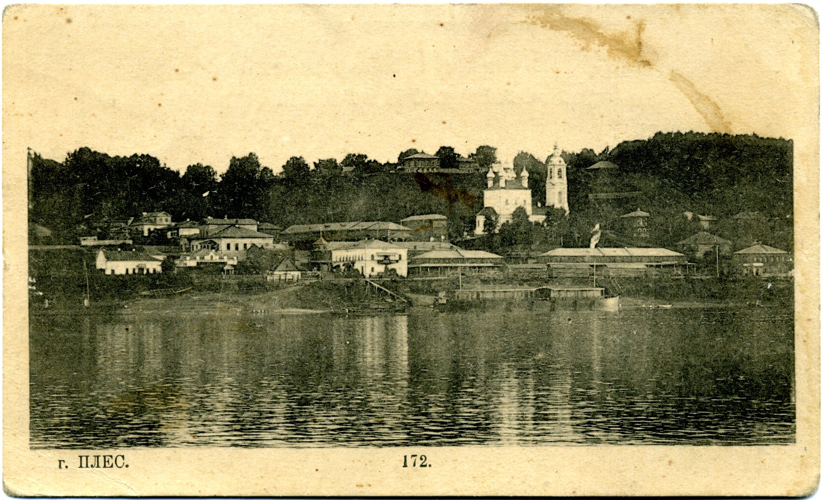 На работе изображена центральная часть плесской набережной. На заднем плане, над скрытой постройками Торговой площадью, возвышается Воскресенская каменная церковь 1817 г. постройки.