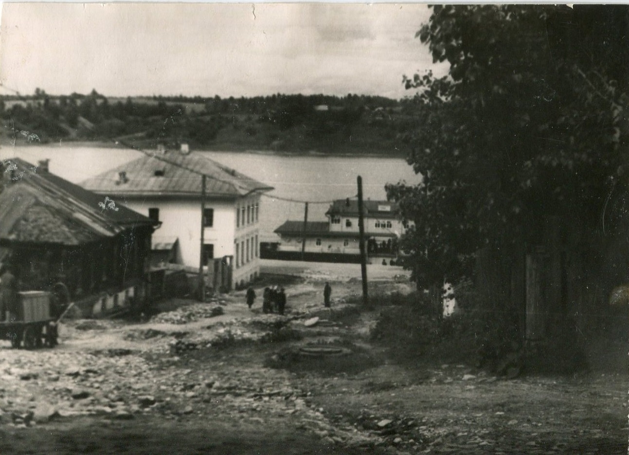 Перед нами вид, открывающийся с улицы Ленина (Воскресенской улицы): переулок, спускающийся к пристани для скоростных судов, скрытой за белым зданием слева, где многие годы размещался филиал ювелирного завода «Красная Пресня». Двухэтажный, тоже кирпичный, оштукатуренный и побелённый дом с красной крышей справа – бывшая городская гостиница.