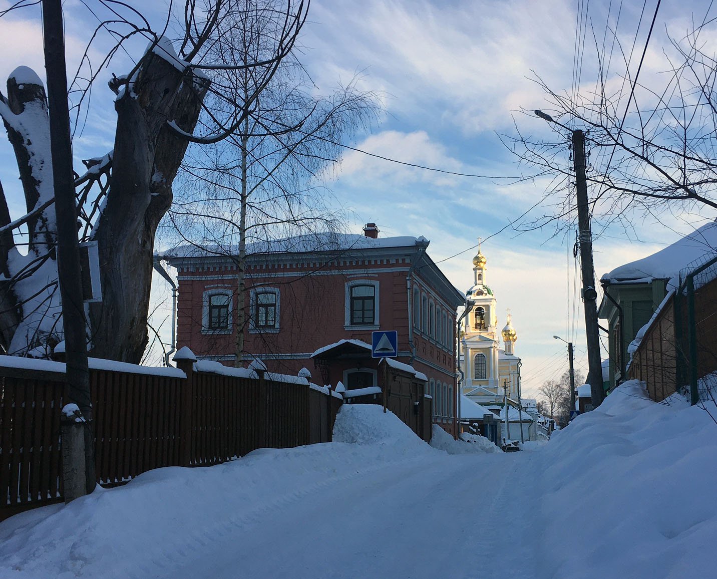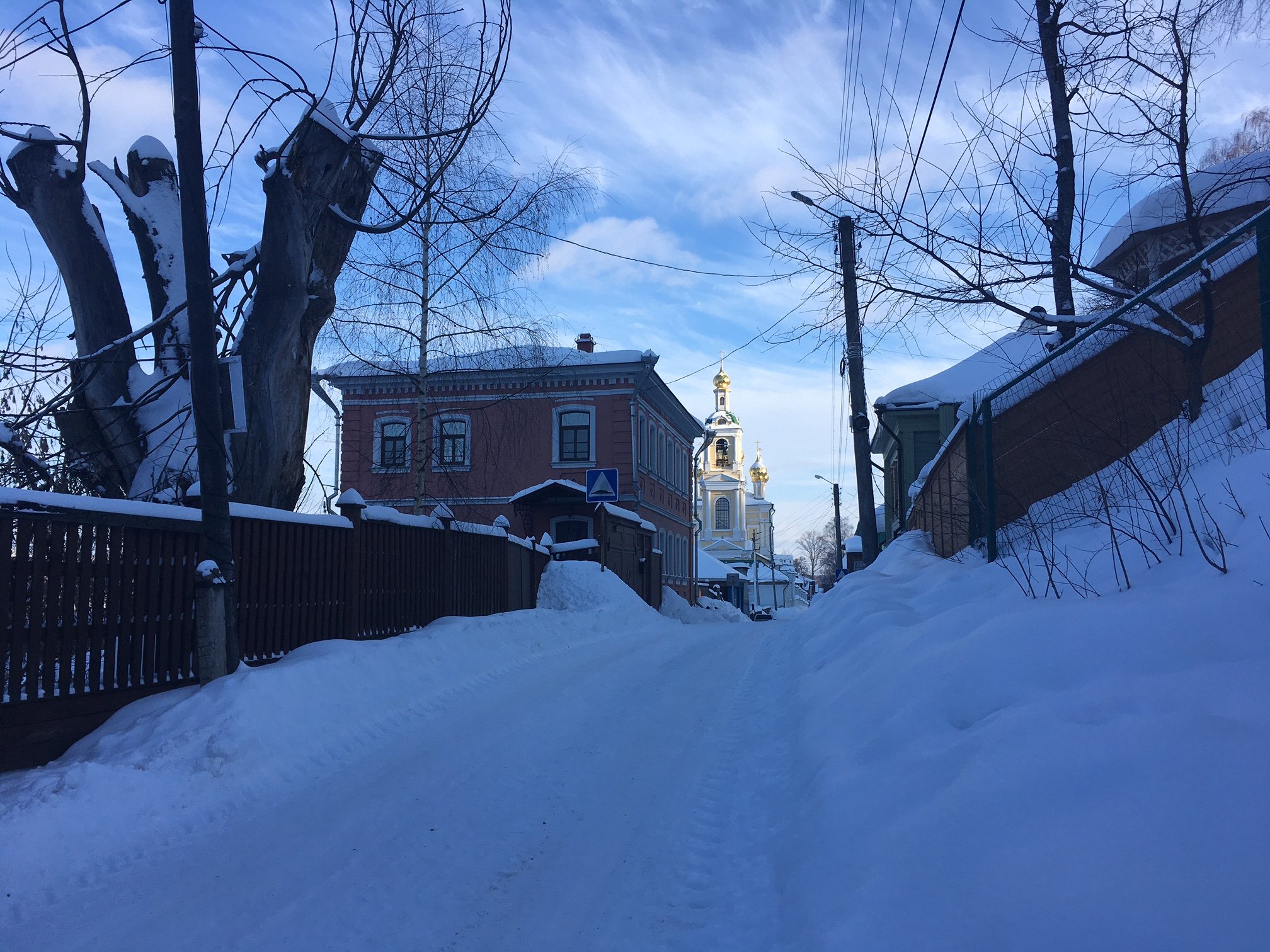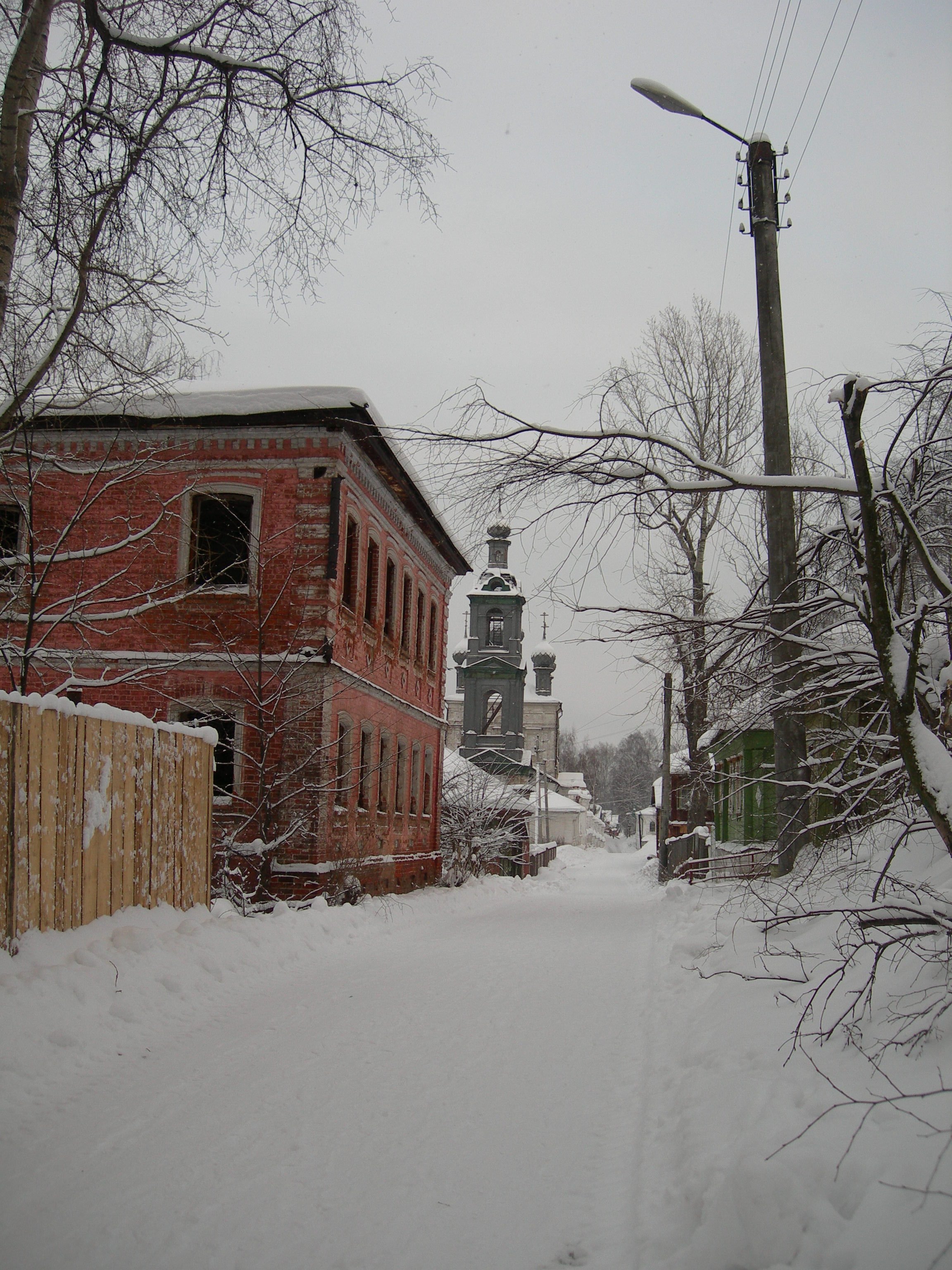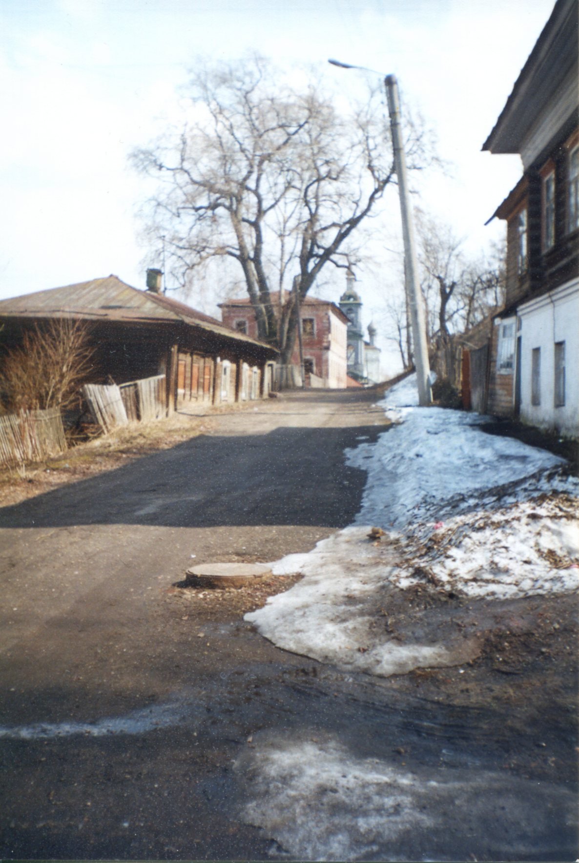 На картине изображен участок улицы Ленина. До революции она именовалась Воскресенской, так как начиналась от Воскресенской церкви, которую мы видим на заднем плане.