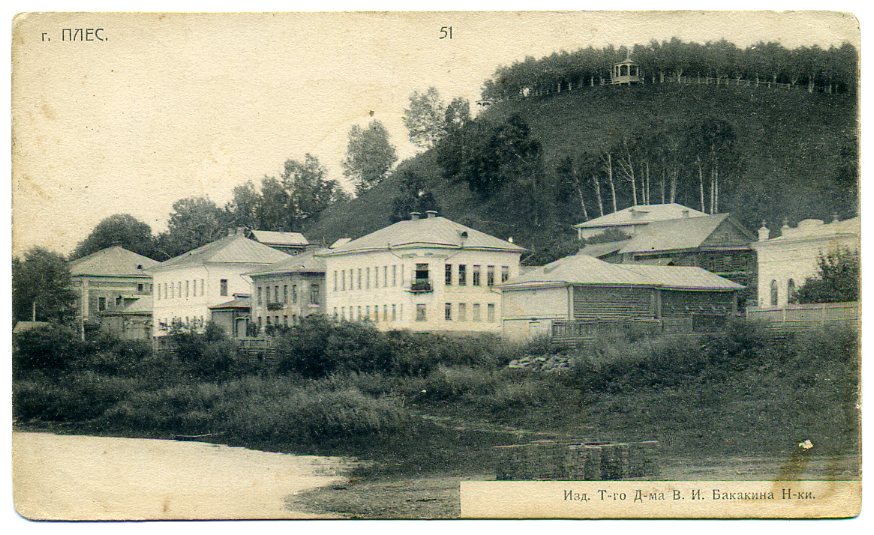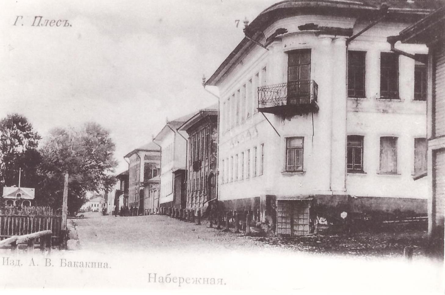 На работе запечатлена плёсская набережная у дома по ул. Советской, 25. Здание было построено в 1820-1830 гг., вероятно, купцом-хлеботорговцем Степаном Васильевичем Маклашиным; позднее принадлежало его сыну Алексею Степановичу. Оно имеет скруглённый угол, украшенный колоннами, так как было предназначено оформить городскую площадь, которую собирались здесь сделать по проекту 1781 г., утвержденному Екатериной II.