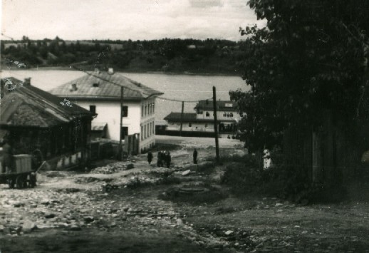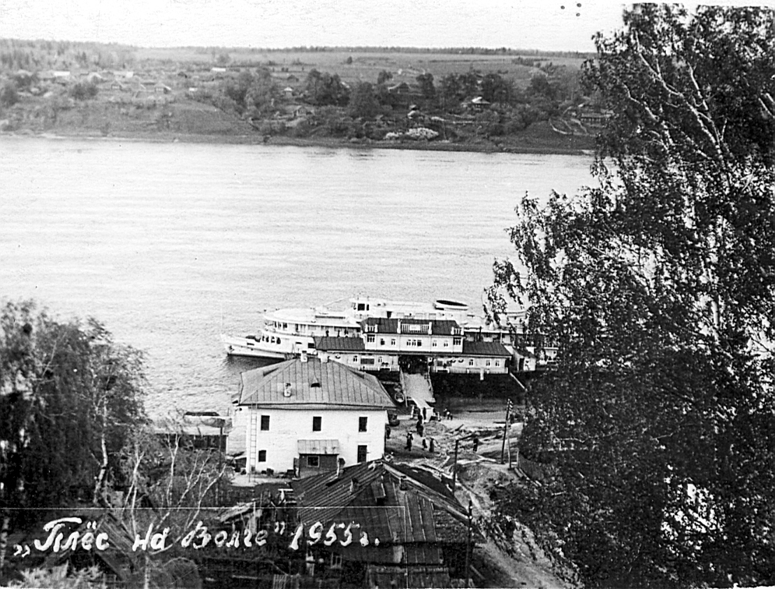 Люди спешат по булыжной мостовой на пароход-колёсник, только что подошедший к деревянной двухэтажной пристани. Всё наполнено жизнью старого волжского городка. Позднее пассажирская пристань была перенесена в центр города, а здесь поставили пристань для быстроходных судов – «Ракет» и «Метеоров».