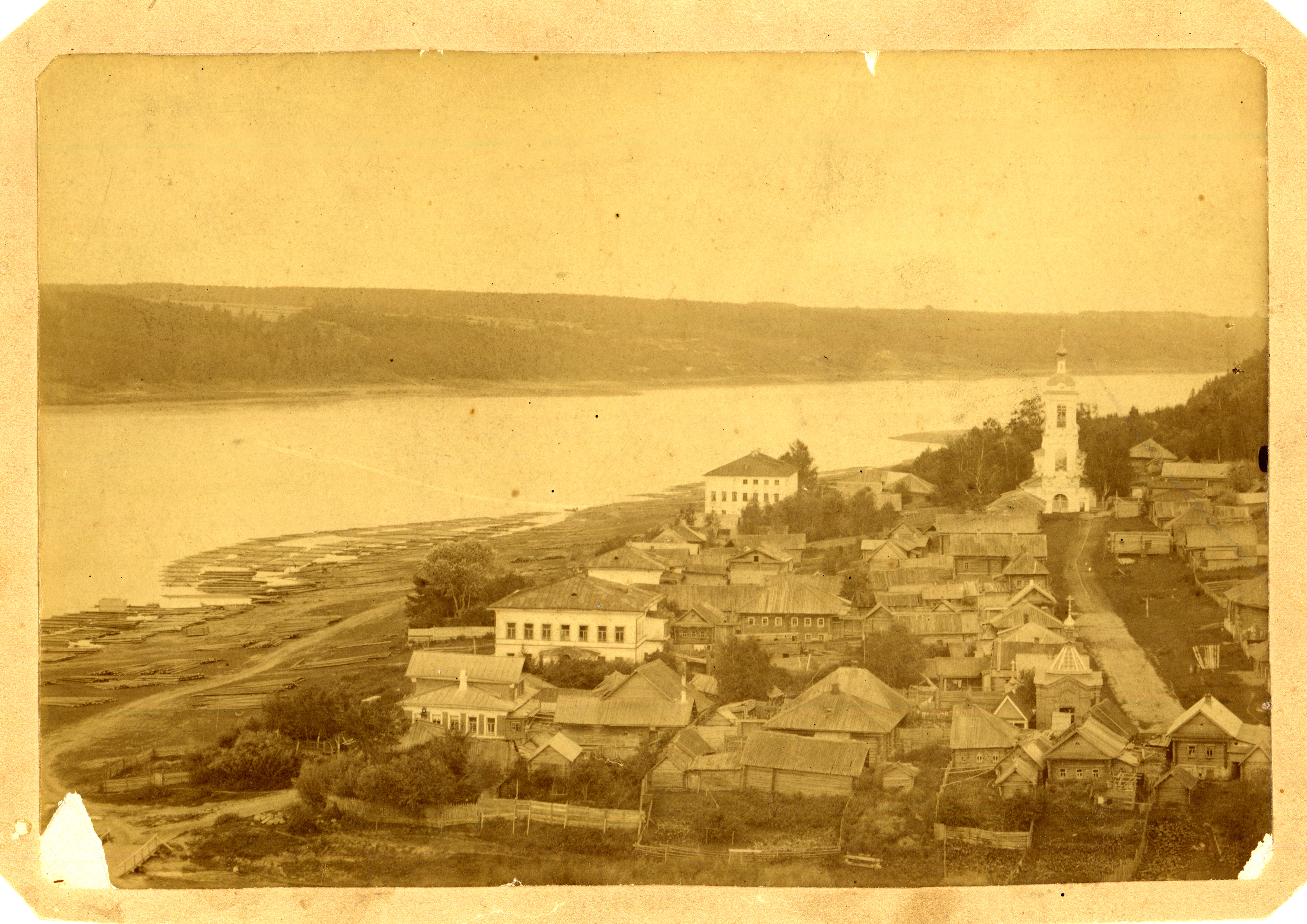 На работе запечатлено Заречье или Зарецкая слобода, как её ещё называли плесяне. Археологические данные свидетельствуют о том, что отсюда, от, вероятно, ещё свободного не городского поселения, получил свое начало город Плёс.