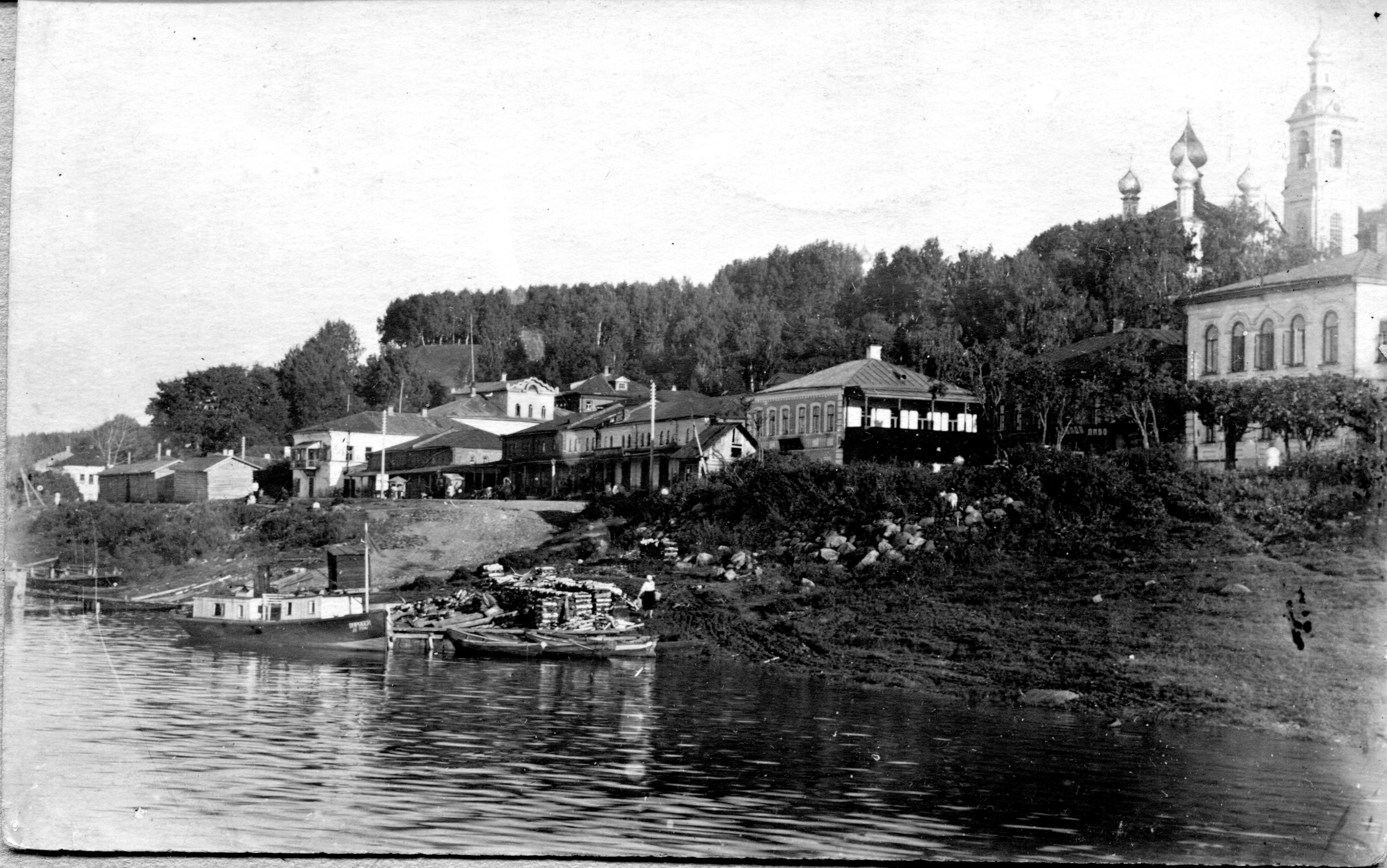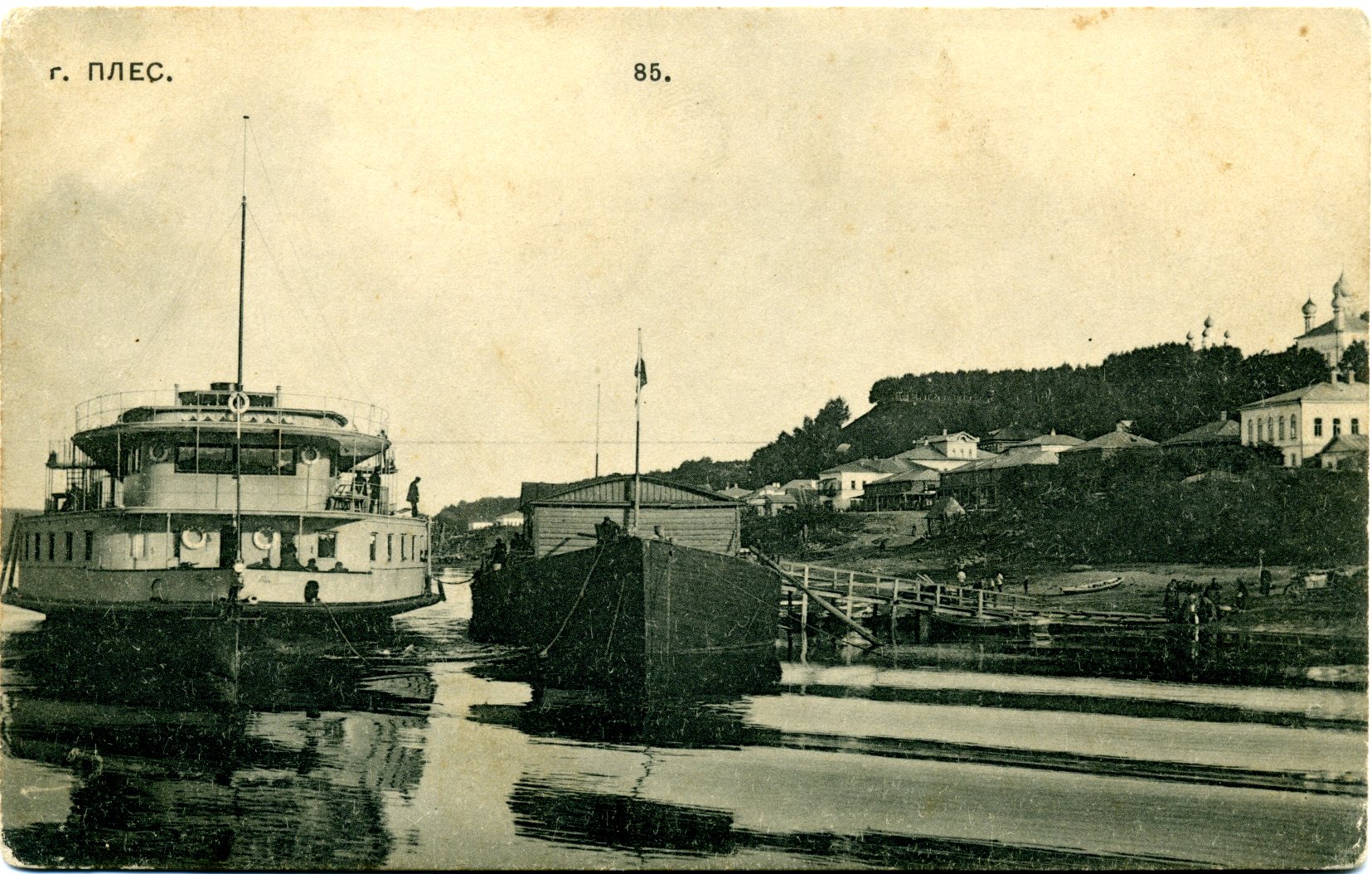 На работе запечатлена центральная часть плёсской набережной. Хорошо видно двухэтажное здание по адресу ул. Советская, 39 - объект культурного наследия регионального значения. В нём в советское время размещался клуб, устраивались молодежные дискотеки, работали детские кружки, ставились спектакли народного театра.