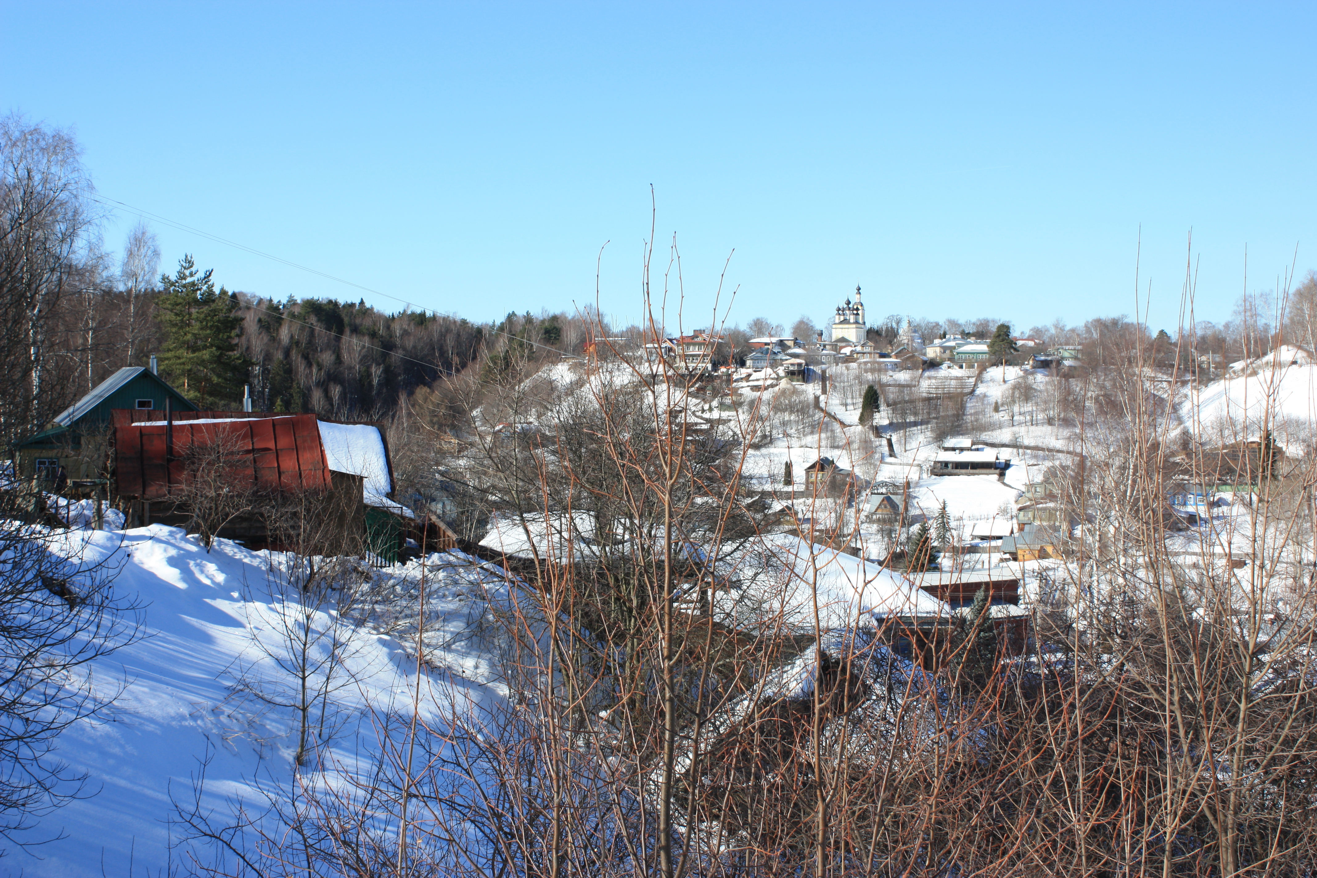 При взгляде на картину прежде всего обращаешь внимание на церковь в правой верхней четверти полотна, но вскоре невольно взгляд перебегает на деревья, а с них - на рыжий бурьян, торчащий из снега на переднем плане. Таким образом, первичное рассмотрение картины идет по сценарию, задуманному художником: глаз скользит по диагонали справа налево и сверху вниз, а затем, после пристального рассматривания множества оттенков снега на переднем плане, снизу вверх вдоль левой границы полотна, упираясь в обобщённо изображенный лесной массив, замыкающий композицию. И уже после всего этого взгляд обращается то к акварельному небу, то к тёплым пятнам, обозначающим строения.