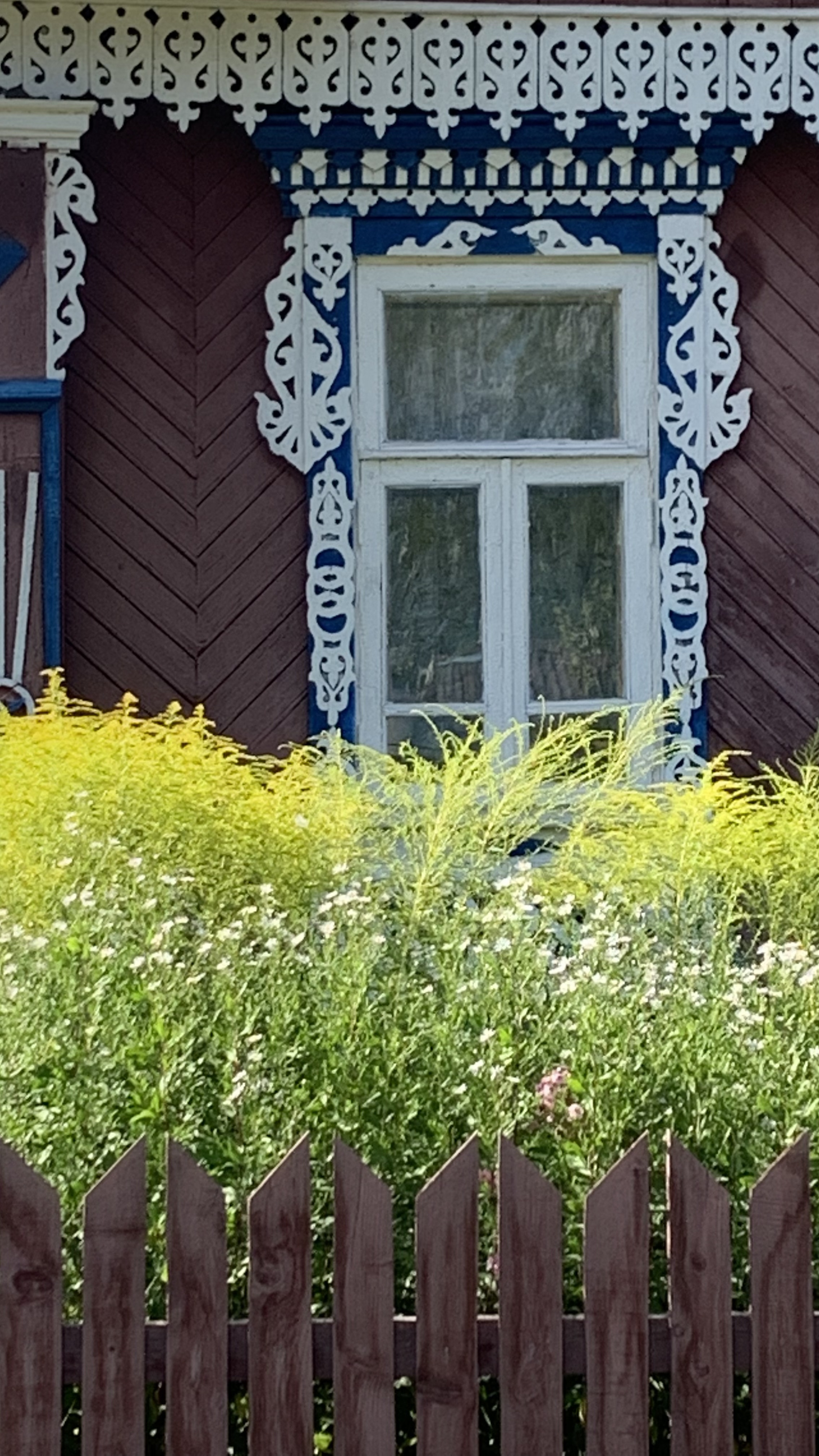 Боковая часть наличника богато украшена пропильной резьбой. В ней можно разглядеть рисунок ростка и древа жизни. Нижняя часть наличника, называемая полотенцем, также богато украшена. Хозяин дома заботливо окрасил наличник в синий и белый цвет, тем самым подчеркнув красоту резьбы, а художница запечатлела каждый завиток.
