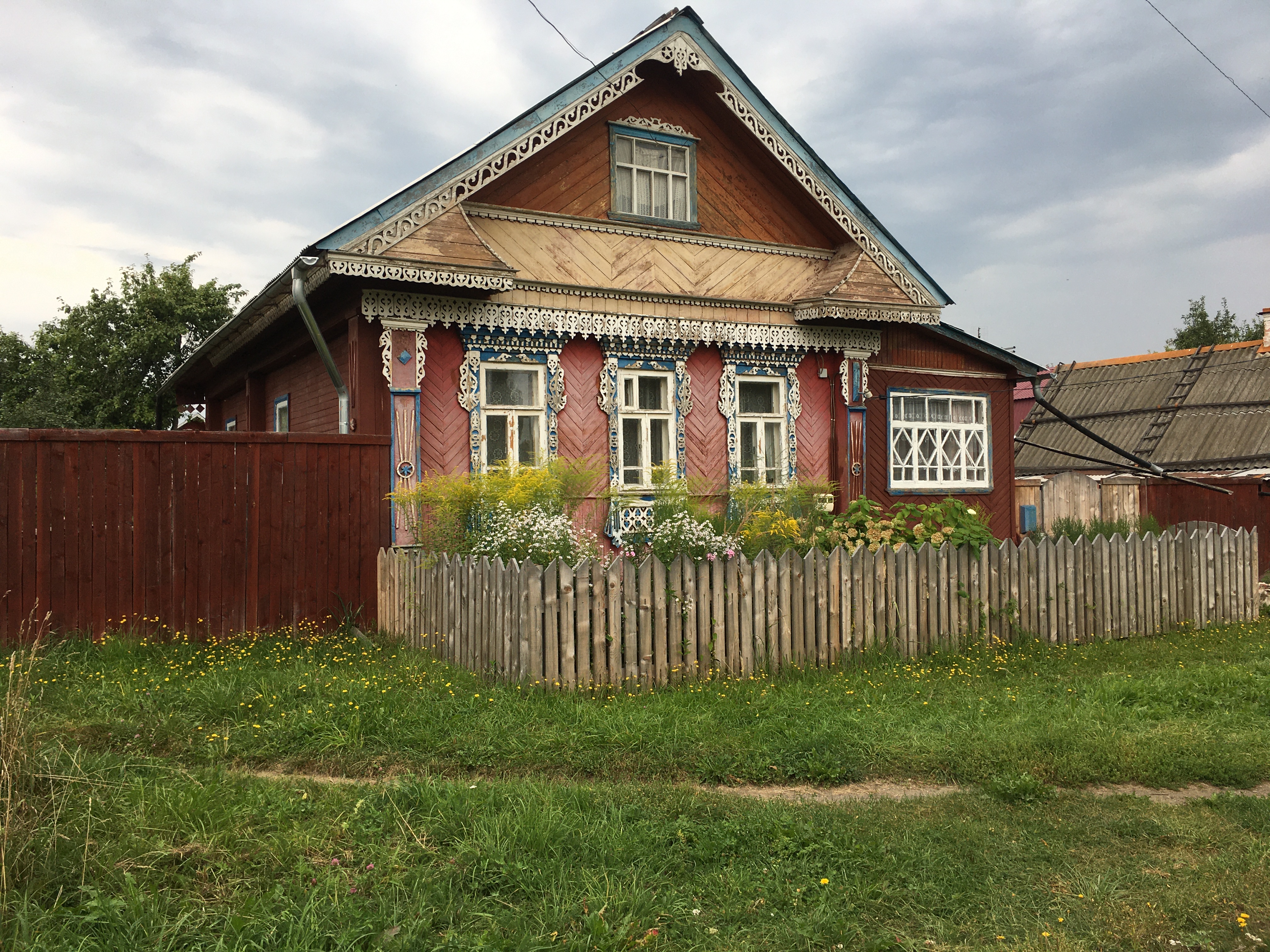 Нателла Георгиевна своей работой передала всю красоту затейливой резьбы наличника на фоне стены дома с дощатой зашивкой в «елочку». Ею прописаны даже старые оконные рамы. Глухая резьба в верхней части с вертикальным повторяющимся элементом означает небесную живительную влагу.