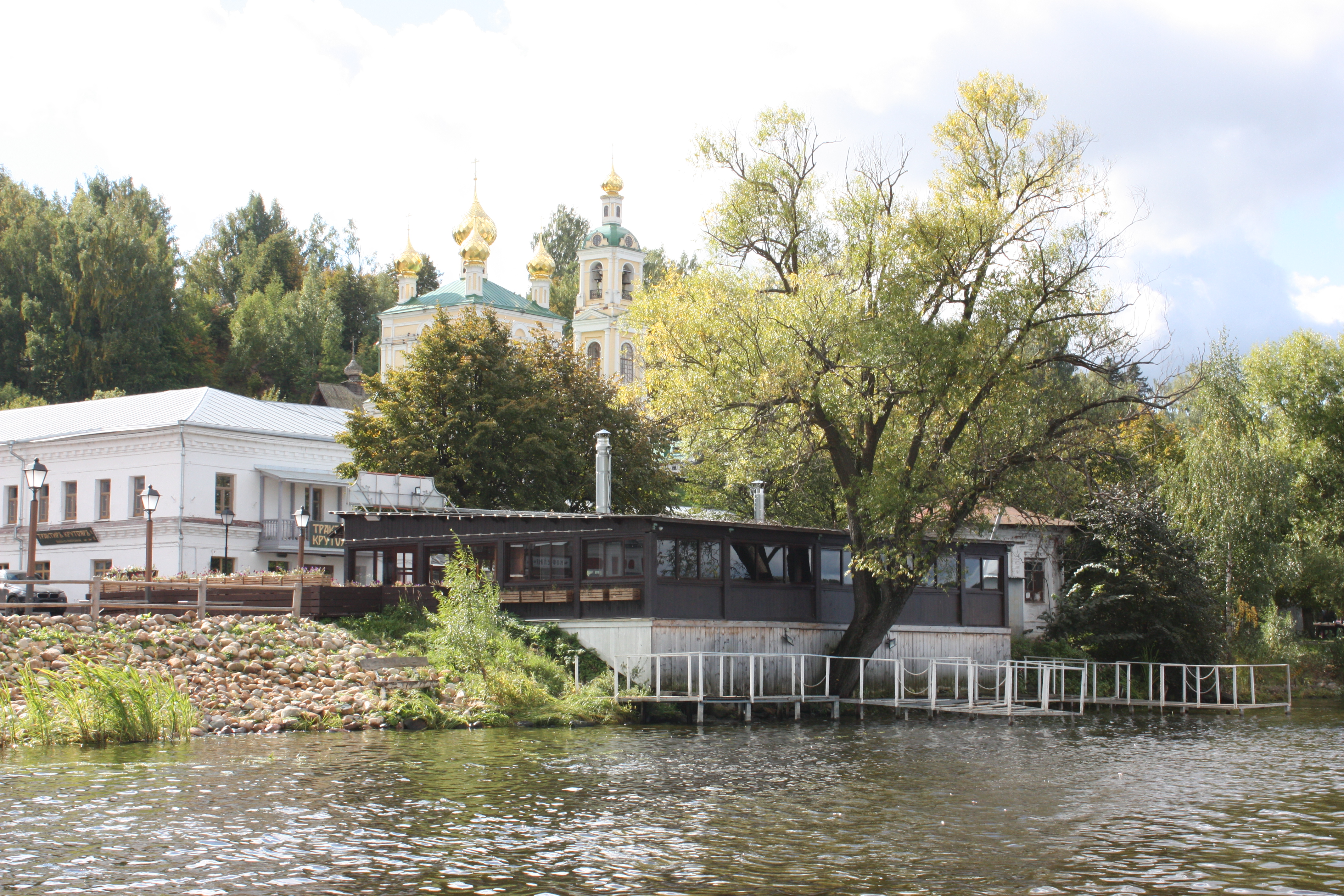 Напротив клуба на берегу видно односкатное деревянное здание кафе «Встреча», в котором любили проводить время и туристы, и жители города. Правее него – белая круглая будка водосбросной станции, обеспечивающей работу городской дренажной системы. Она была построена в 1950 гг. перед запуском Горьковского водохранилища. Из-за повышения уровня воды в Волге на 8 метров прежняя самотёчная дренажная система стала нуждаться в принудительной откачке воды в Волгу.