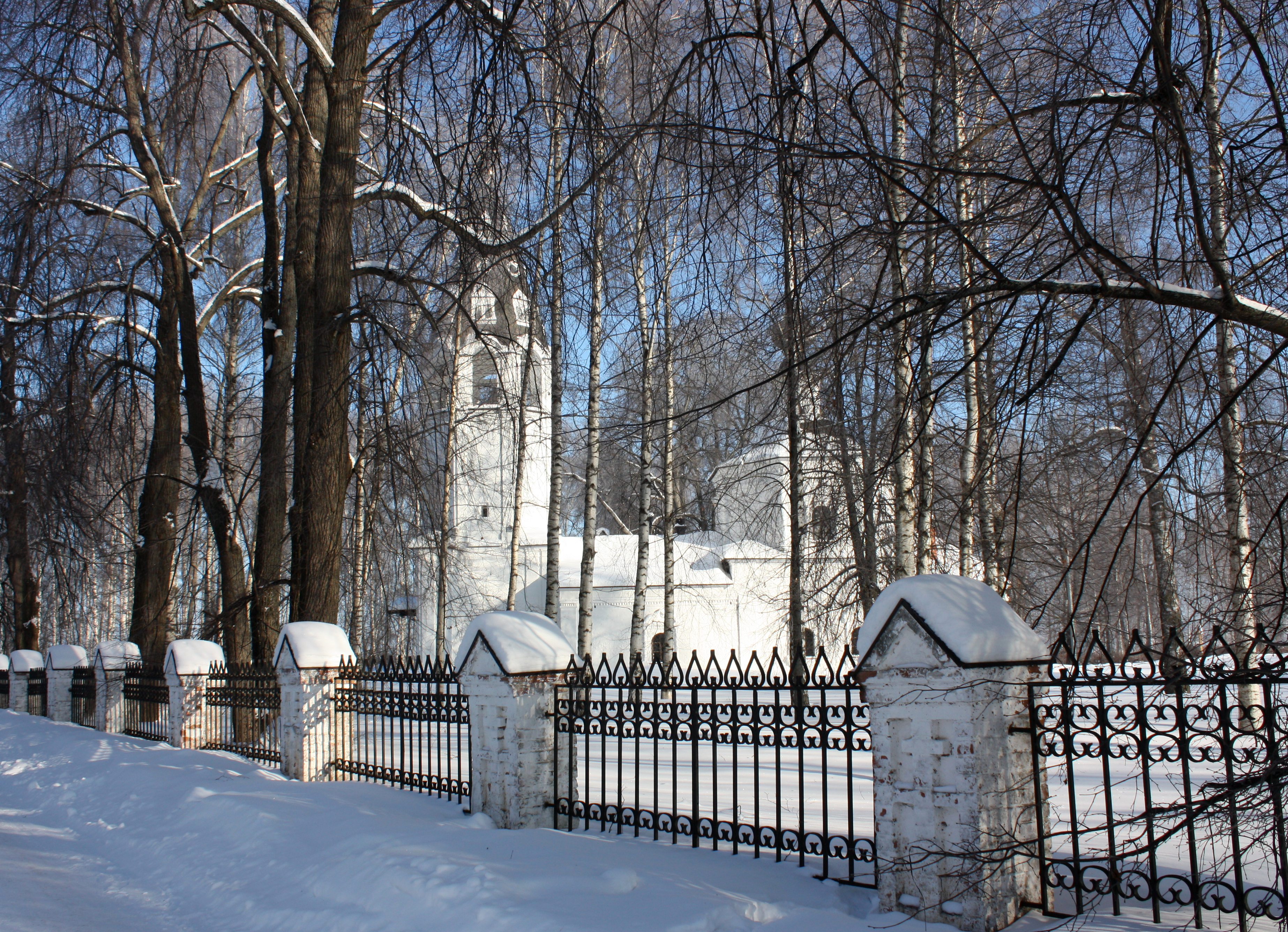 Лёгкий морозец, полуденный свет неяркого зимнего солнца, тишина, и только снег поскрипывает под ногами. Работать приходится быстро, часто меняя кисти, чтобы не застыли краски. Получился «портрет» церкви на фоне зимнего пейзажа. Плотными корпусными мазками «сконструированы» каменные стены, купол, колокольня с пустыми арочными проемами без звонницы, а за ней – густая синева неба. Так же густо и плотно изображён сиреневый снег. От берёз протянулись по снегу синие тени. Игра бликов и теней расцвечивает белизну оштукатуренных стен храма розово-сиреневыми, зеленоватыми и сине-серыми оттенками… Работа завершена. Растерев озябшие пальцы, убрав кисти и краски, художник складывает свой этюдник.