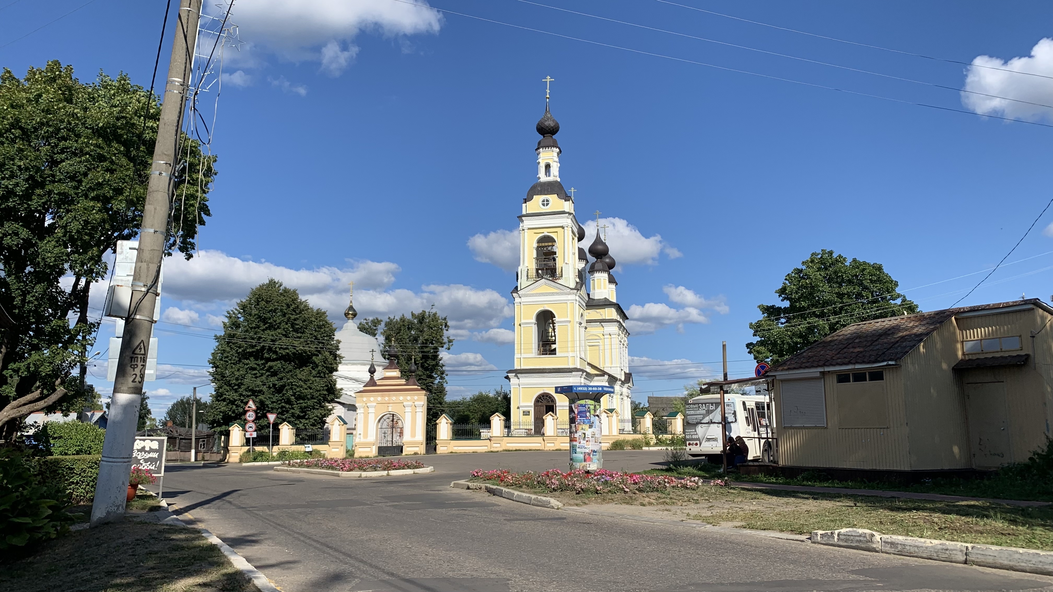 Плёсская автостанция находится в бывшей Троицкой слободе, сформировавшейся вокруг Троицкой и Введенской церквей. Ранее на этом месте стоял деревянный храм Троицы Живоначальной, известный с 1628 г. В 1712 г. его заменили новым деревянным строением. В 1778 г. здесь уже было два деревянных храма: летний (Троицы Живоначальной) и зимний (Введенский).