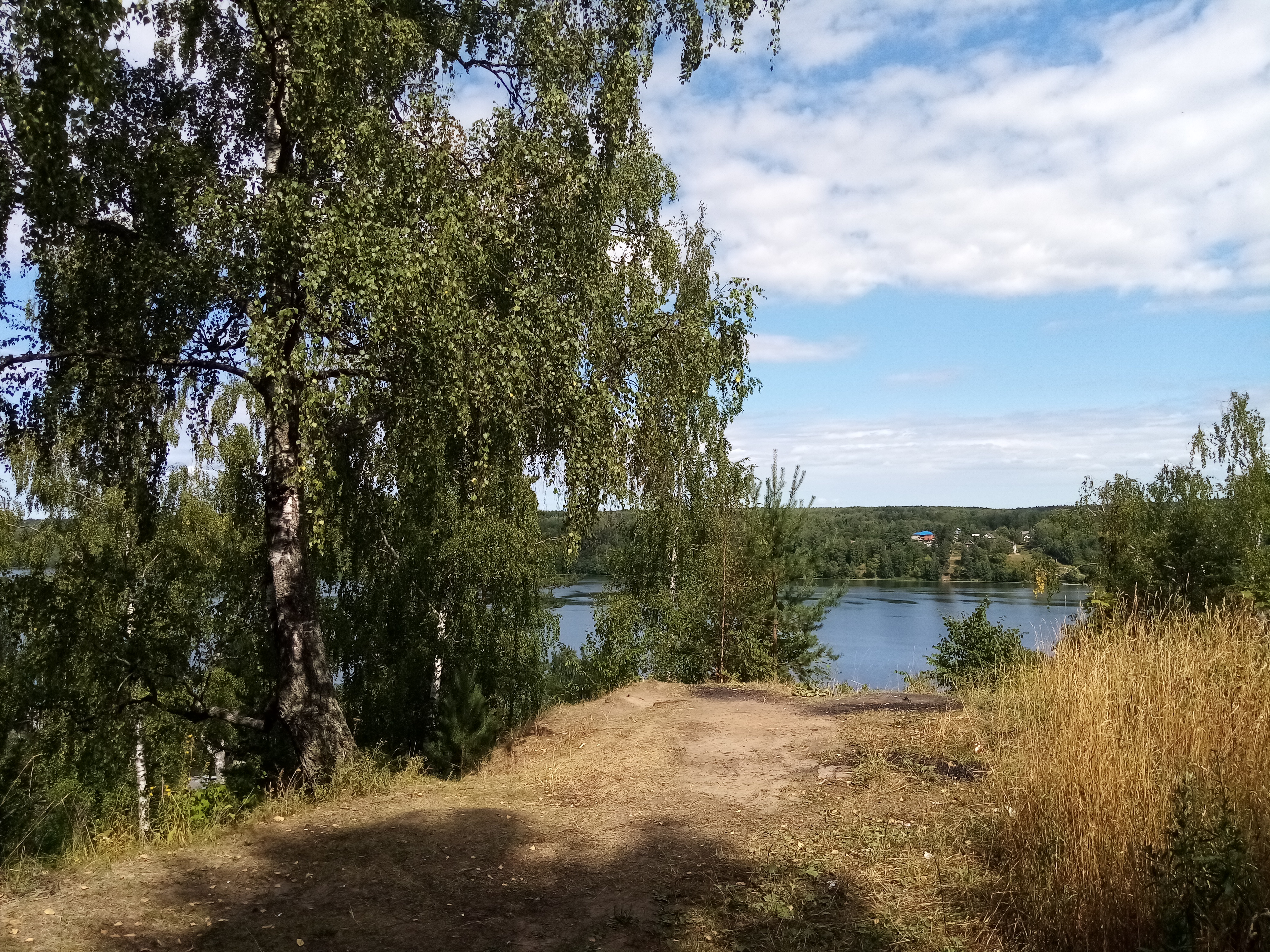 Работа написана с холма со старой березой на склоне. Напротив – серебристого цвета Волга и противоположный берег с деревней Серково.