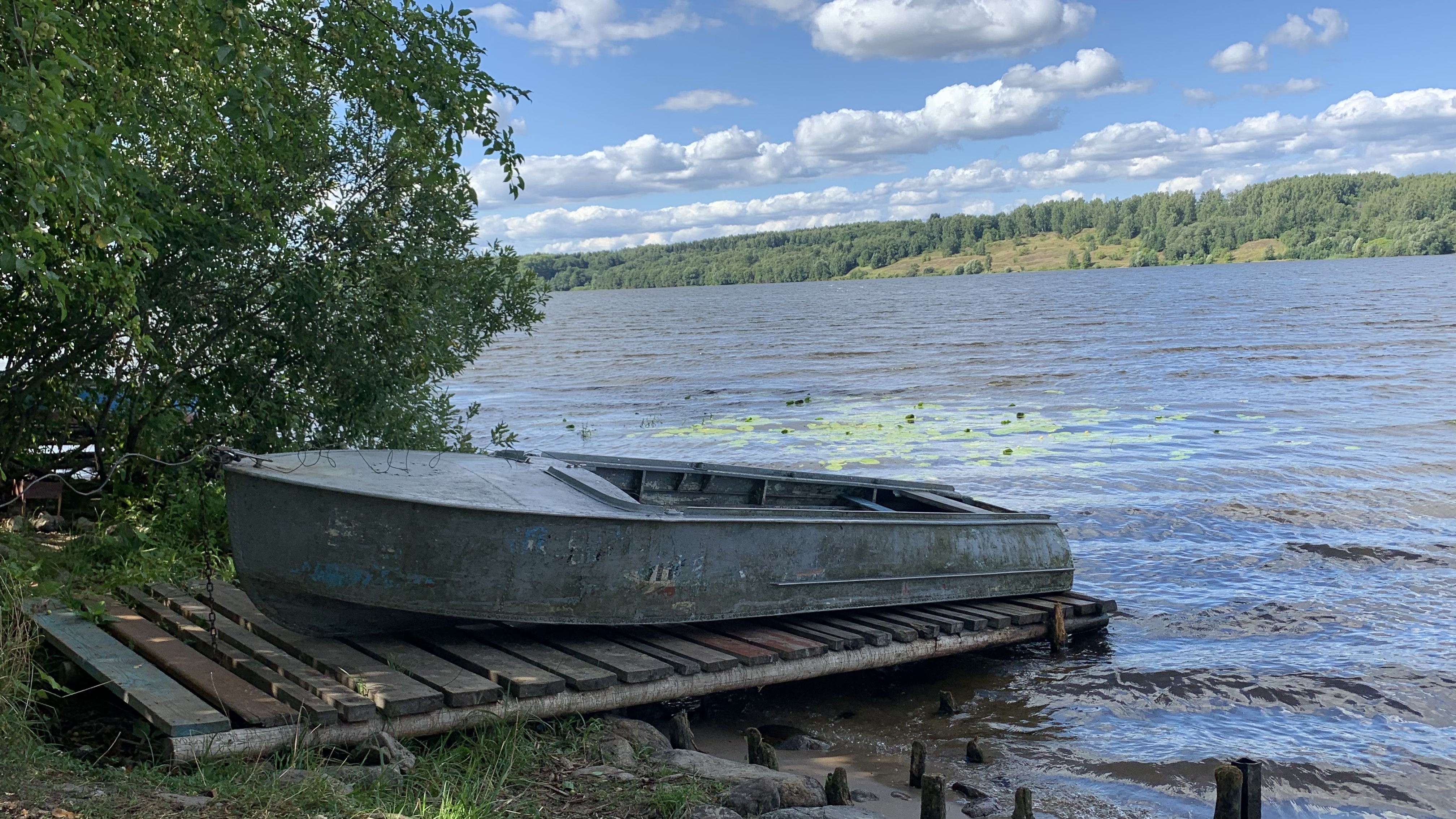 Художник запечатлел редкую для нашего времени деревянную лодку, которую хозяин ласково назвал «Берёзка». Мостки, у которых стоит лодка, очевидно находятся в верхней по течению Волги части Плёса, об этом можно догадаться по тому, что на противоположном берегу не видно строений.